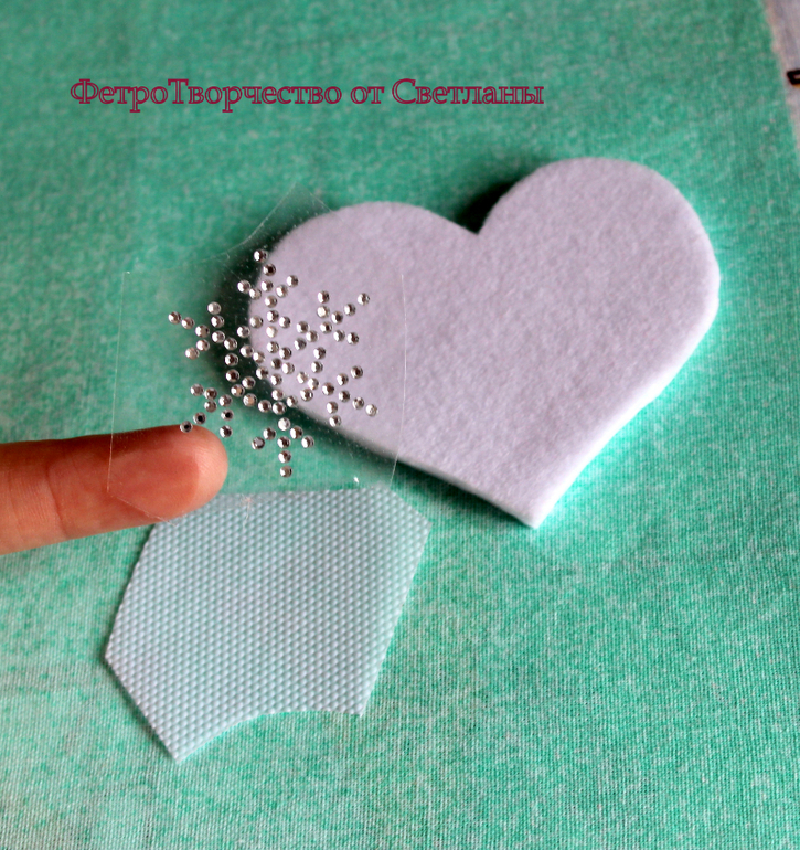 Убрали ткань (марлю) и можно поднимать осторожно пленочку со страз. Если все хорошо, то все стразы должны остаться на нужном месте. Если же несколько страз остались на пленке,то нужно аккуратно вернуть пленку назад -накрыть тканью - поставить утюг еще на несколько секунд.
