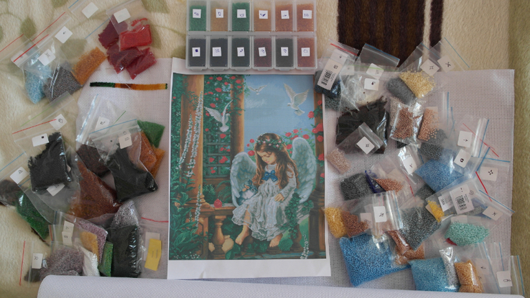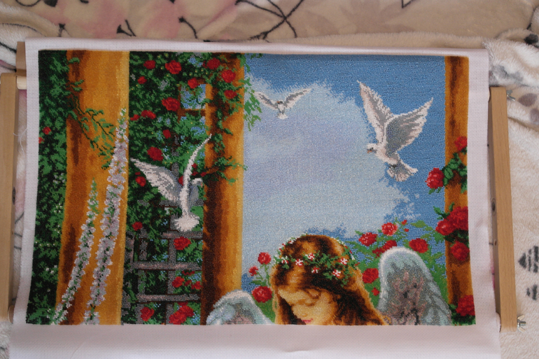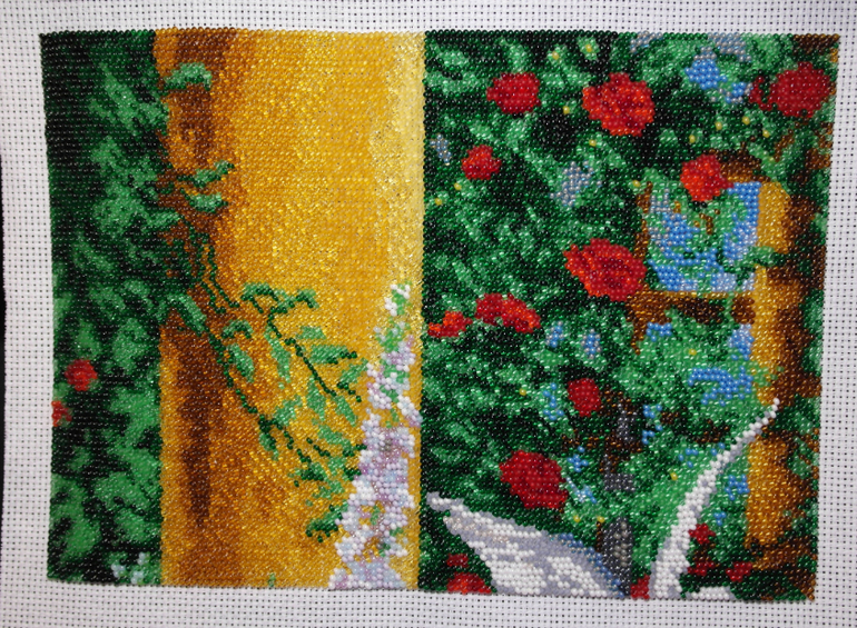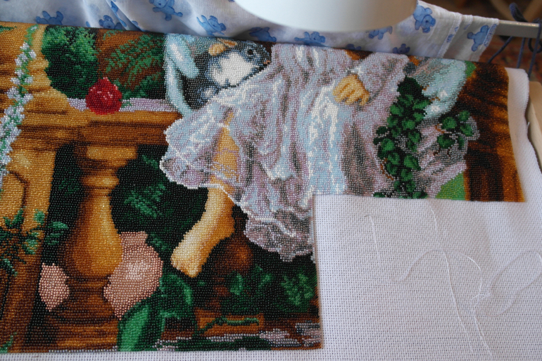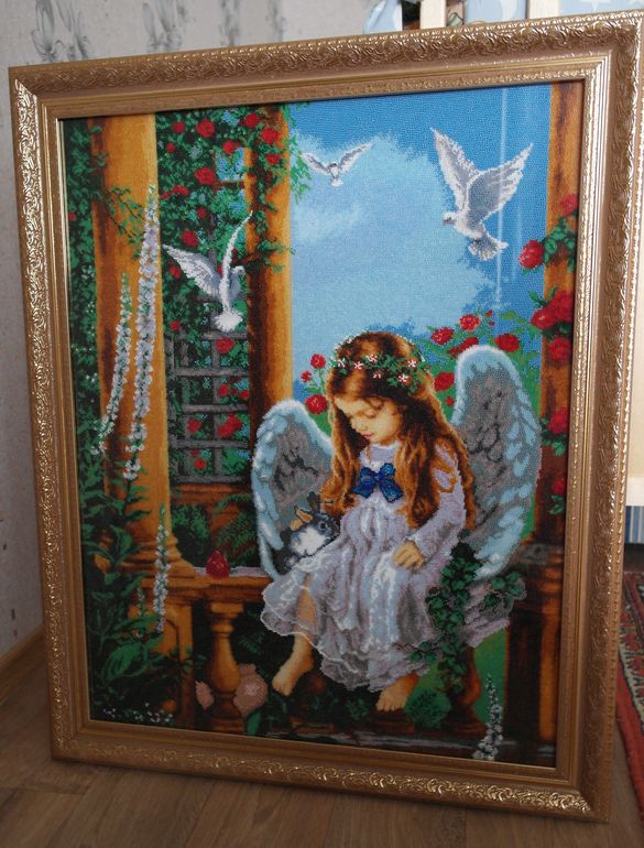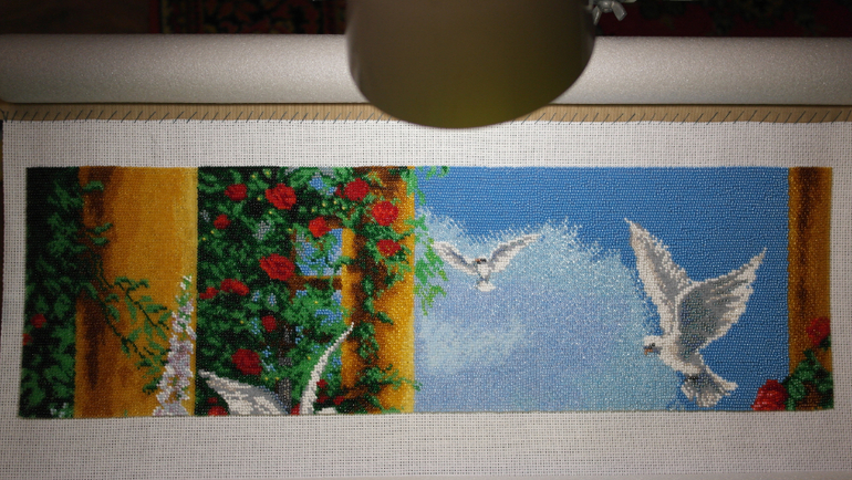 Вот такая шикарная картина получилась. 55х68см без рамы, 300х370 бисеринок, 56 оттенков бисера, полная зашивка бисером. А вот так создавалась