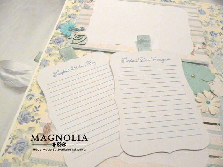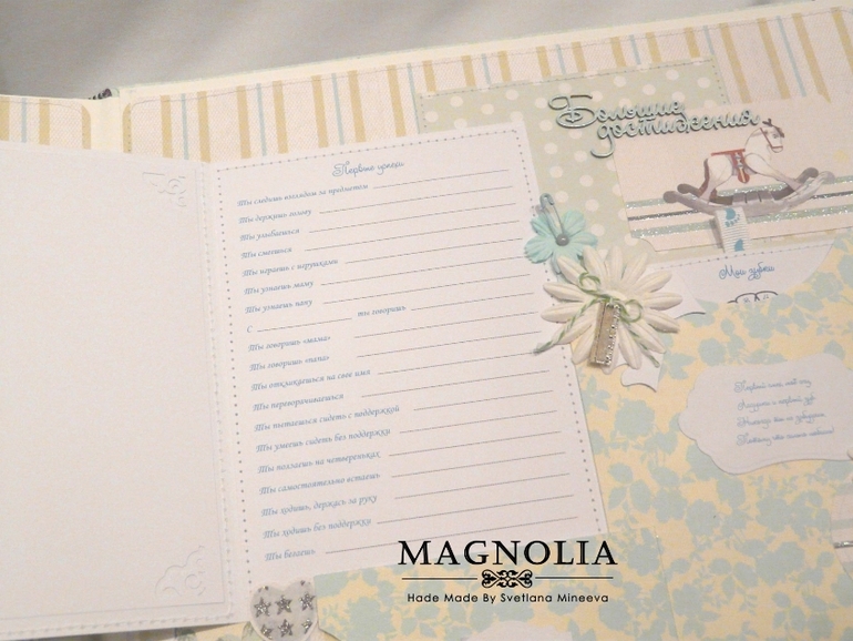 - Страница для записи достижений: теги для обводки ножки и ладошки, теги с данными по весу/росту и зубкам, поел для записи достижений, кармашки для локонов, бирочки