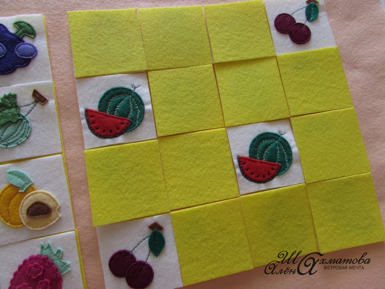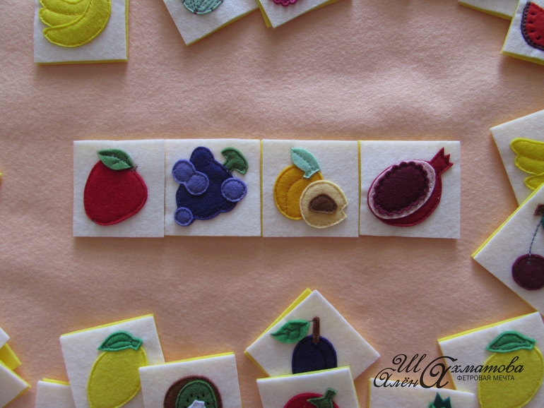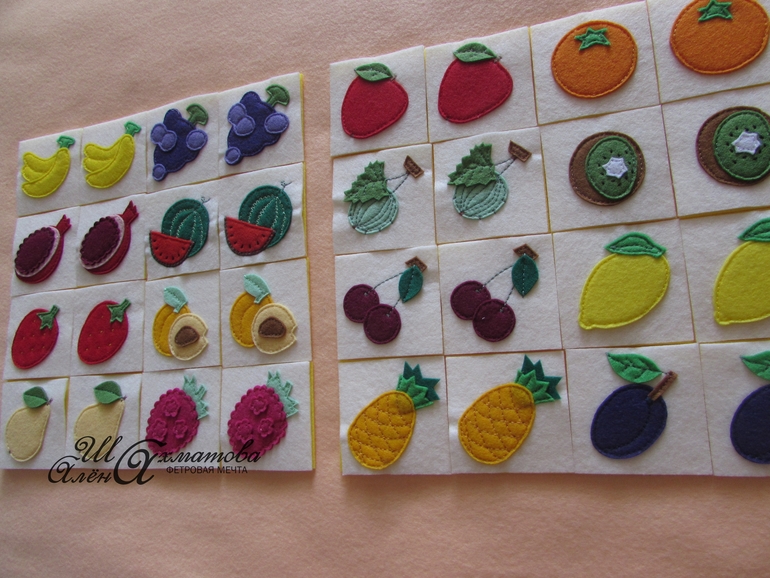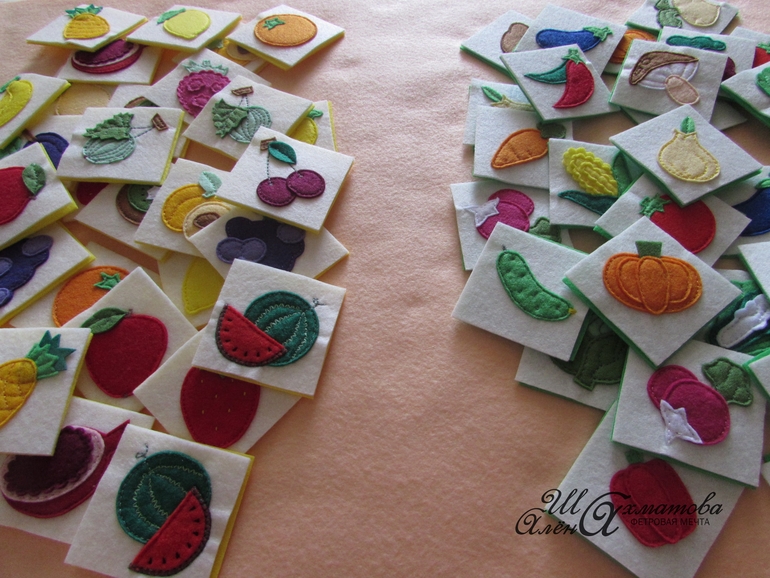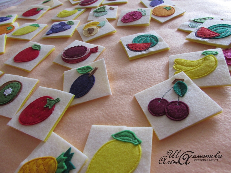 Карточки размером 5х5 см, из жесткого корейского фетра с аппликацией. Всего 32 карточки по две штуки каждого вида. Сшито полностью вручную (без использования клея). Обратную сторону карточек просили пока не пришивать.