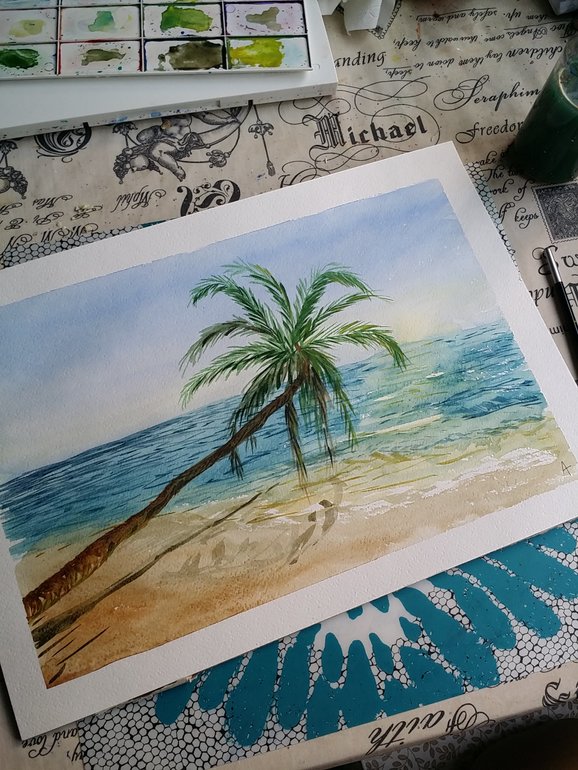 Вот такое оно у меня. Я вообще не очень с акварелью дружу, мне интересно немного другое, но вчера было такое акварельное настроение, что море и песочек очень акварельными захотели быть).