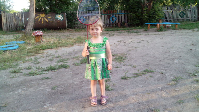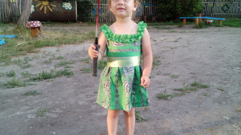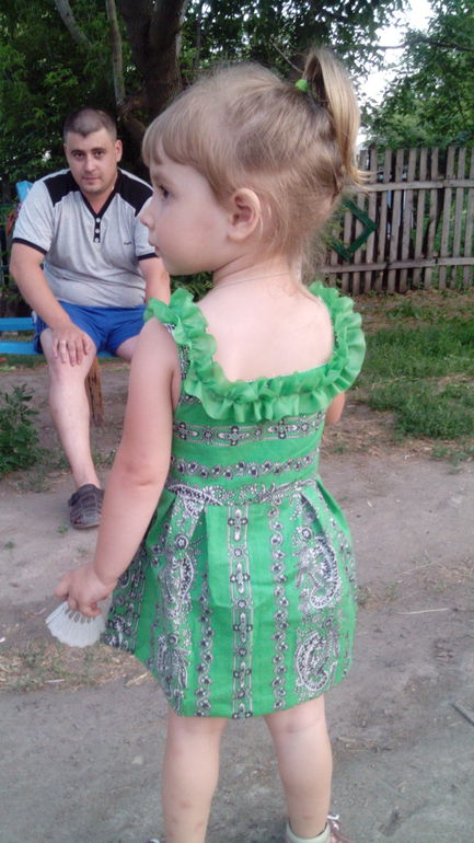 Шила бабушка, а придумывали фасон вместе, походу дела. Выкройки не использовали, шили "на глаз")))) На фото платье еще не отглажено, так как после примерки дочурка не захотела его снимать, и сразу помчалась на улицу