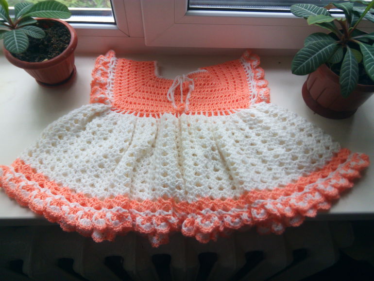Вязала из пряжи Бисерная (белого цвета) и Пехорка детская (розовая и персиковая), всего израсходовано 3 моточка белой и по 1 моточку розовой и персиковой на 2 платья, крючок #2,5.