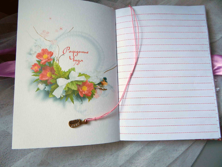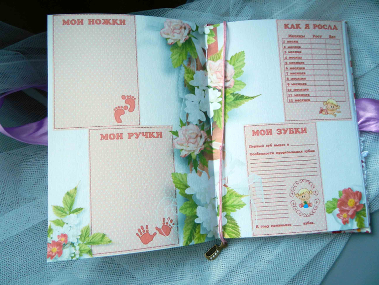 Есть красивое трогательное стихотворение, место для записей о беременности, родах, первых 12 месяцах жизни детки, первом дне рождения, раздел, где мамочка запишет первые слова и фразы, а так же разворотик для отпечатков(обрисовок) ручек, ножек, график роста и веса, график роста зубиков. В общем, смотрите, много фото)))