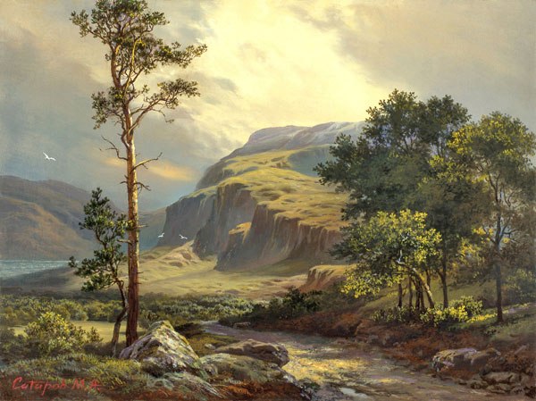 Оль! Написала коммент, не посмотрев весь пост, пришлось удалять. Я оценила твою копию, поругала автора картины, но подлинник- то вполне так очень даже хорош. А у тебя живописные ошибки есть- задний план слишком прописала, потуманнее и попризрачнее его Надо сделать. На переднем плане очень заскульптурила кусточки и камешки — как по трафарету, неживые и очень много плоско цепляет взгляд- акцентов 9 насчитала. См автора- вижу невольно только камень слева сразу, Композицию камней справо затем и полянки поодаль слева в конце, это как хорошие духи — раскрывается слоями аромат, красота! Холодность не на пользу...Настроение становится непонятно, если грустно- надо добавить символов — сухих темных коряг, сумрачных полянок, не знаю, северного чего- то. И забелила склон горки и на переднем плане растительность, словно снегом, а у автора это туманчик и отблески солнца от тёплого песка и камня... Вот всё, что в глаза бросается, не серчай! Хочу, что б ты живописала покруче!