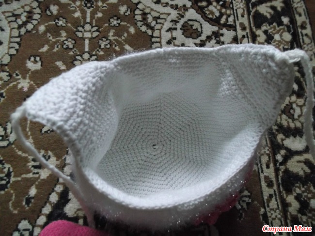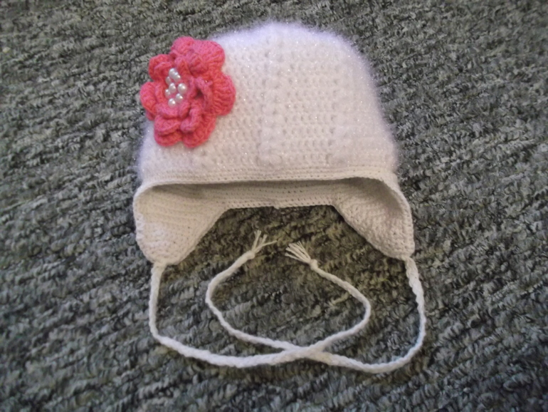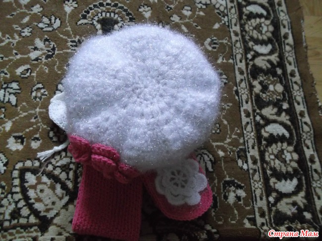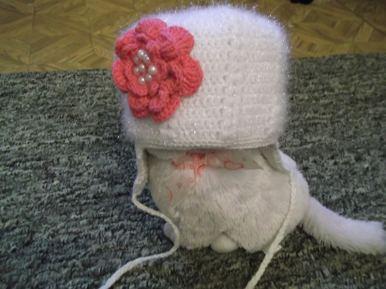 Вязала пряжей YarnArt Christmas саму шапочку верхнюю в две нитки, ушло почти 100 грамм, нижняя шапочка, цветочек на шапке и шарфик YarnArt Jeans ушло белого 50 грамм и розового 50 грамм, крючок №3.
