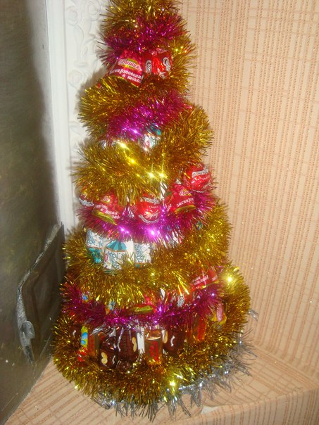 Именно на этом сайте я нашла неплохую идею для оформления елки своими руками. Делала елку из конфет, дочь была в восторге. .