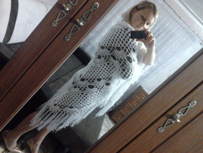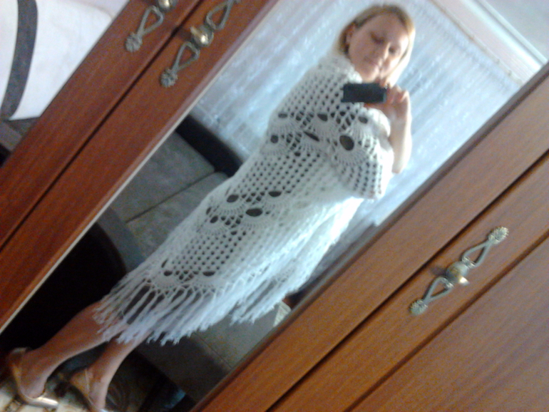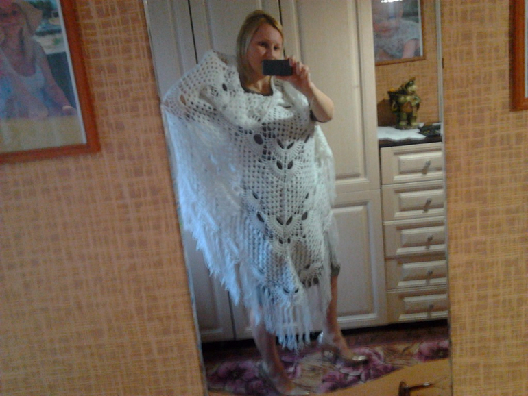 в размахе 3м., высота 1,5м. ниточки -пряжа детская полушерсть Ализе Шекерим, крючок №4. Шаль получилась воздушная, очень мягкая приятная на ощупь-и теплая, это вторая шаль в моей жизни моих трудов-и я считаю очень удачно для второго раза: