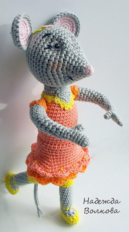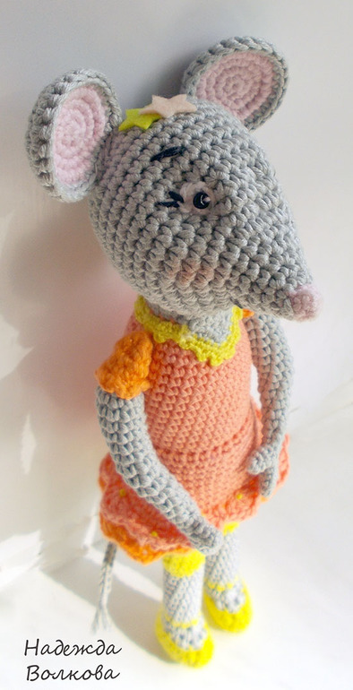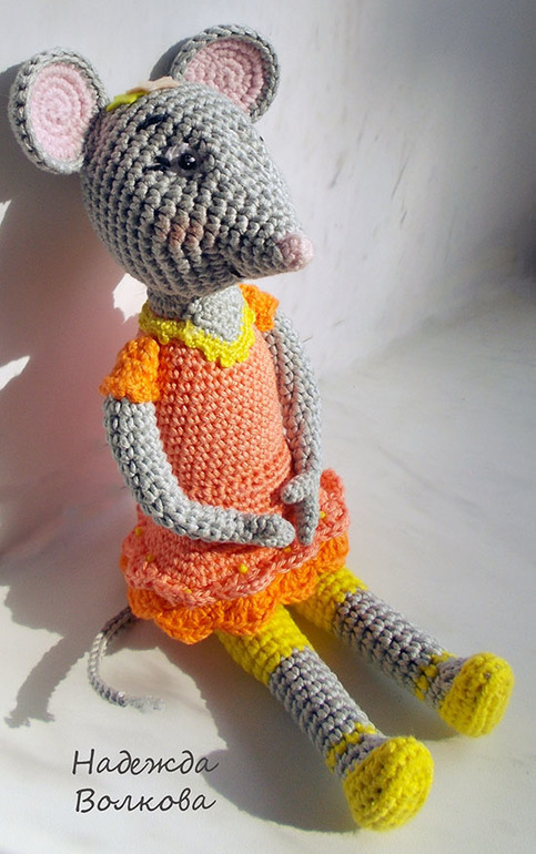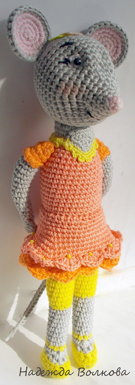 Связала мышку из мультика "Ангелина балерина" для доченьки Санечка . Пряжа разных марок на основе хлопка, крючок в основном 2. Вики сидит и стоит с опорой, нжки и ручки на проволочном каркасе - гнутся. Ростиком мышка Вики вышла 26 см.