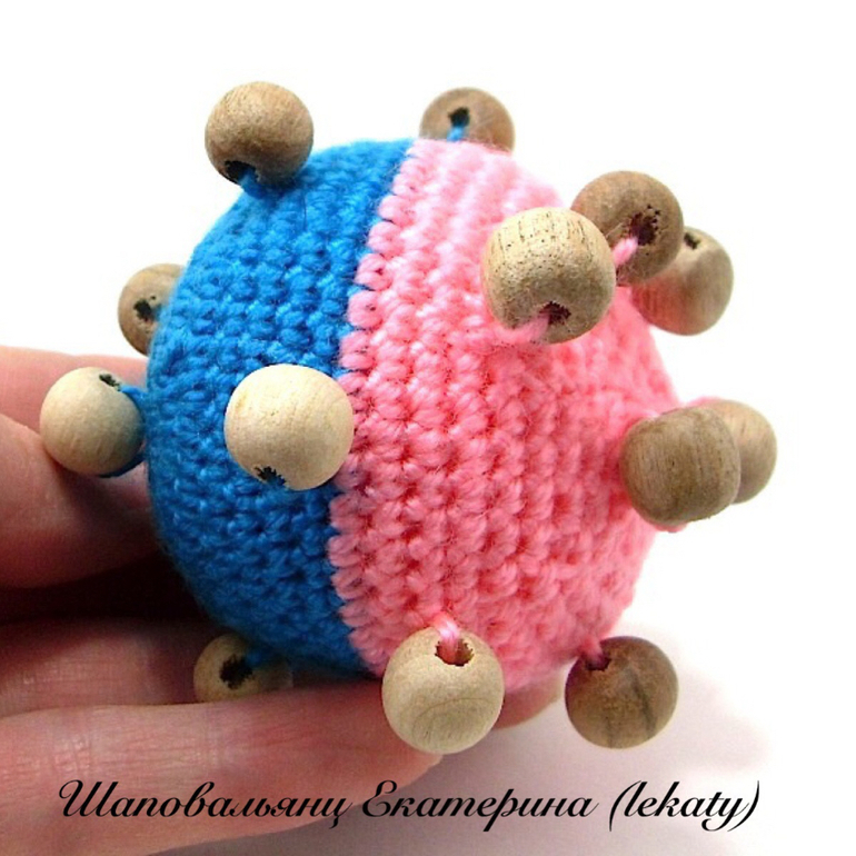 Связались у меня уже давненько вот такие тактильные игрушки-погремушки для деток от года) Размер мячиков около 6,5 см. Материалы: акрил, холлофайбер, деревянные бусины (орех), погремушка. Бусины не пришиты, а ввязаны в основу мячика, поэтому оторвать их практически невозможно. А еще такой мячик можно использовать в качестве массажного, а так же это - неплохая игрушка-антистресс для взрослого (без погремушек внутри), упругая, а бусины мягко массируют руку, снимая раздражение и успокаивая. Еще фото под катом