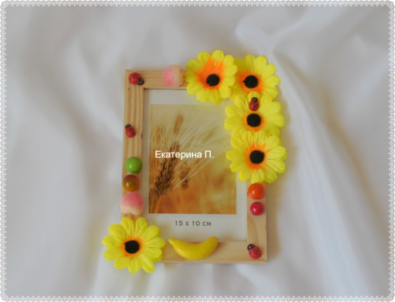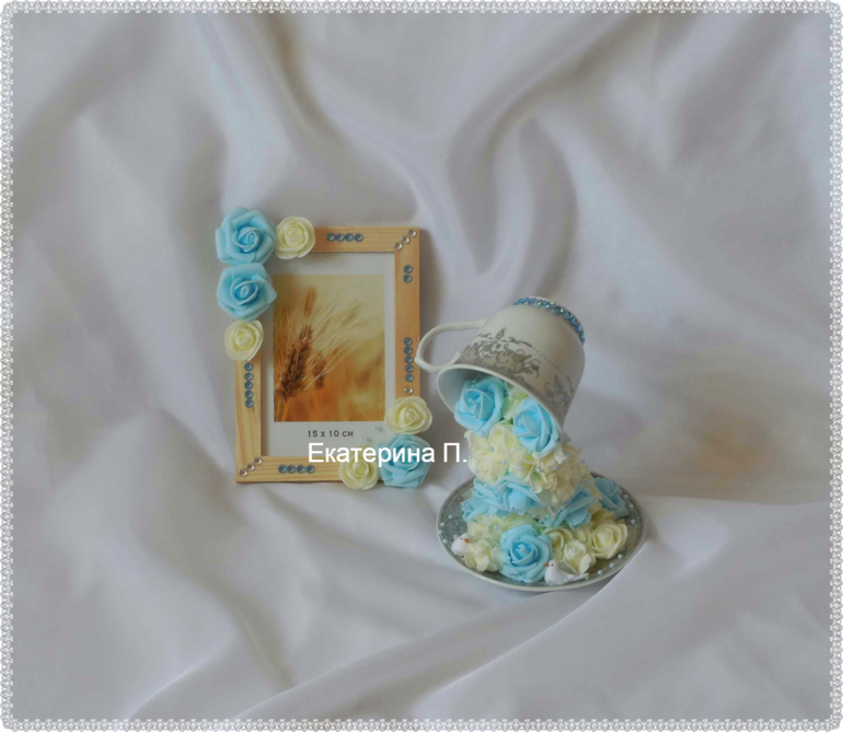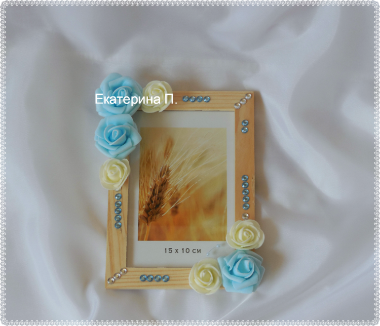 Голубая получилась свадебной, поэтому решила в дополнение к ней украсить фоторамочку.