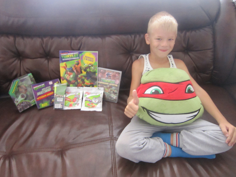 Супер Фея конечно же Альбиночка!)Аличка .. что сказать...ты не перестаёшь нас удивлять! Черепашка Дон- Темкин любимчик и такого у нас в коллекции еще не было!) чему сын был безумно рад! диск очень кстати-сейчас сын занят его просмотром) в обнимку с подушкой-ниндзей)-фото подушки ниже....любимое дело лепить и рисовать и раскрашивать своих героев конечно же) ну и вкусняшки конечно пошли в ход!) Спасибо тебе ,дорогая за такие теплые...позитивные эмоции!!!