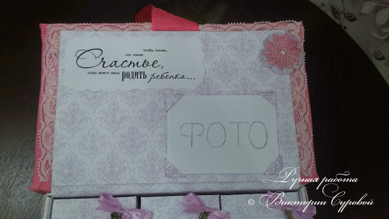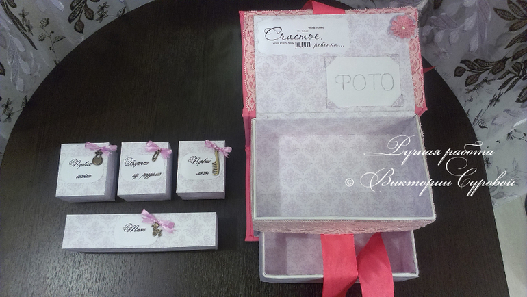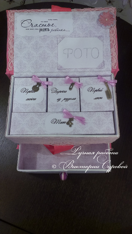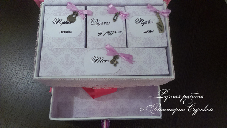 внутри 4 коробочки - для первой сосочки, бирочки из роддома, первого локона, и теста. внизу ящичек для хранения других памятных вещей, может быть крестильный набор, или первая одежда, или мамин блокнотик. на крышке внутри место для первой фотографии.