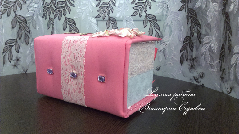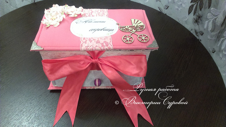 коробочка размером 21*19 см . Сделана из переплетного картона, обтянута коробочка синтепоном и итальянским хлопком. Украшена кружевом, деревянной колясочкой и цветочками.