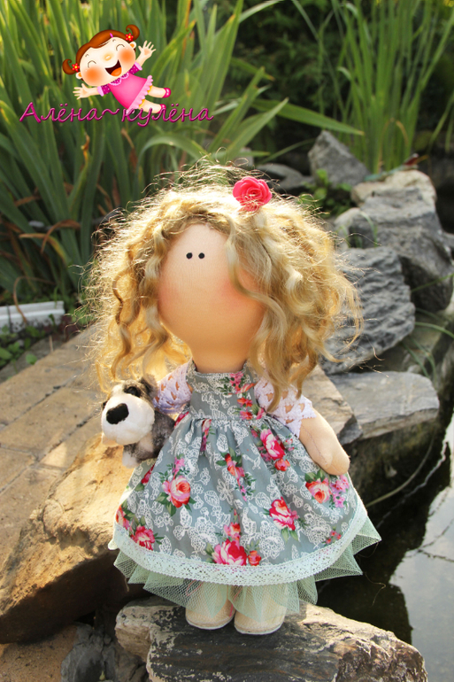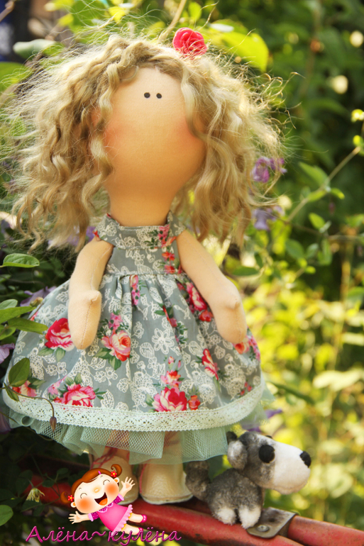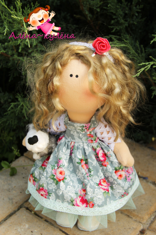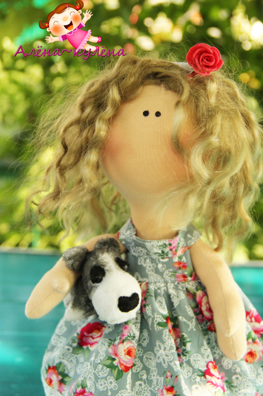 Эту малышку я шила для свей племянницы, ей скоро будет 2 года, и ее мама очень хотела, чтобы девочка была похожа...потому зовут ее Полинка и у нее есть любимый друг - пес Тишка, у нее мягкие непослушные, пушистые волосики цвета пшеницы...одежда и обувь снимается...сарафан на пуговичке, подъюбник на резинке, туфельки на шнурках и кружевное болеро, волосы украшает кружевная лента и заколка с розочкой...ну и плюшевый, тонированный Тишка (может кто узнает в нем Серёжу-Надёжу