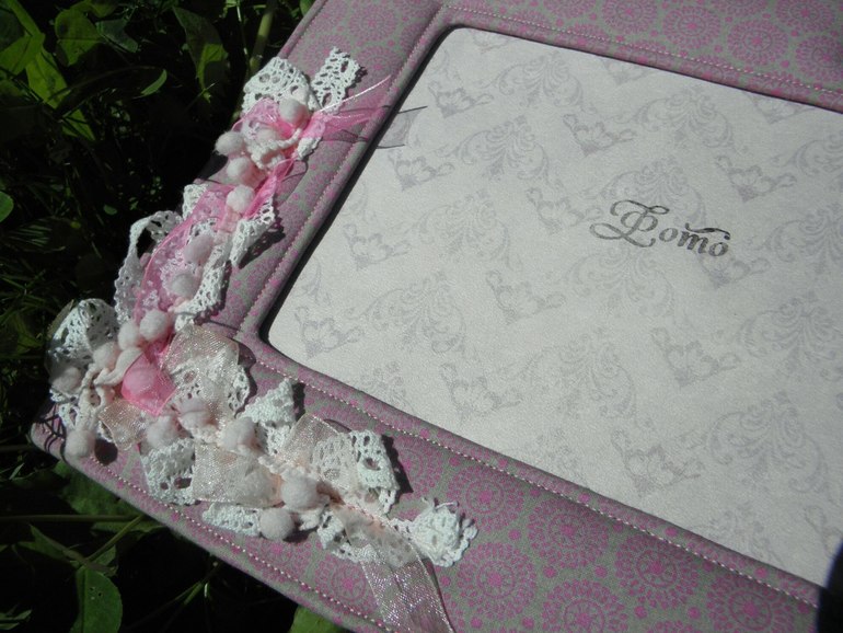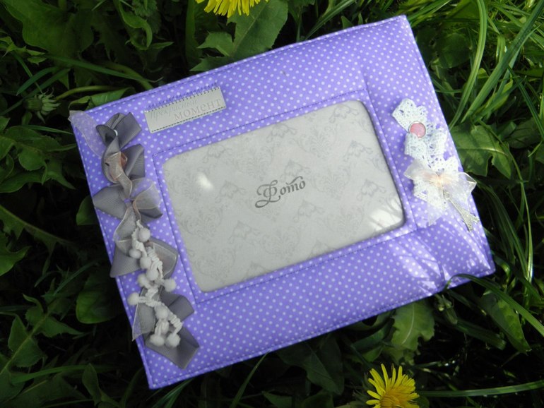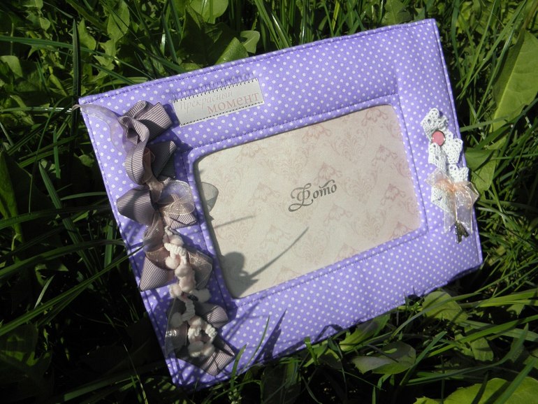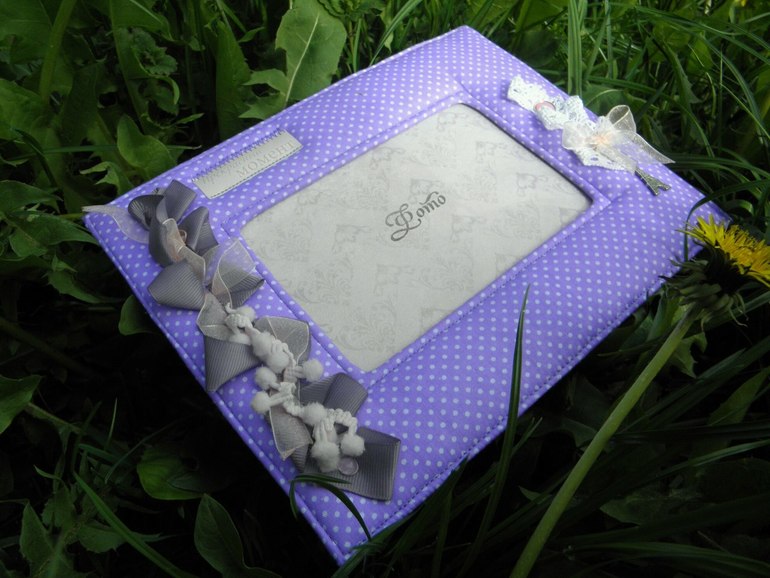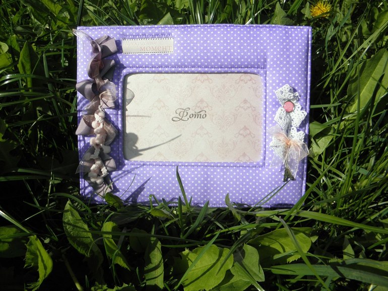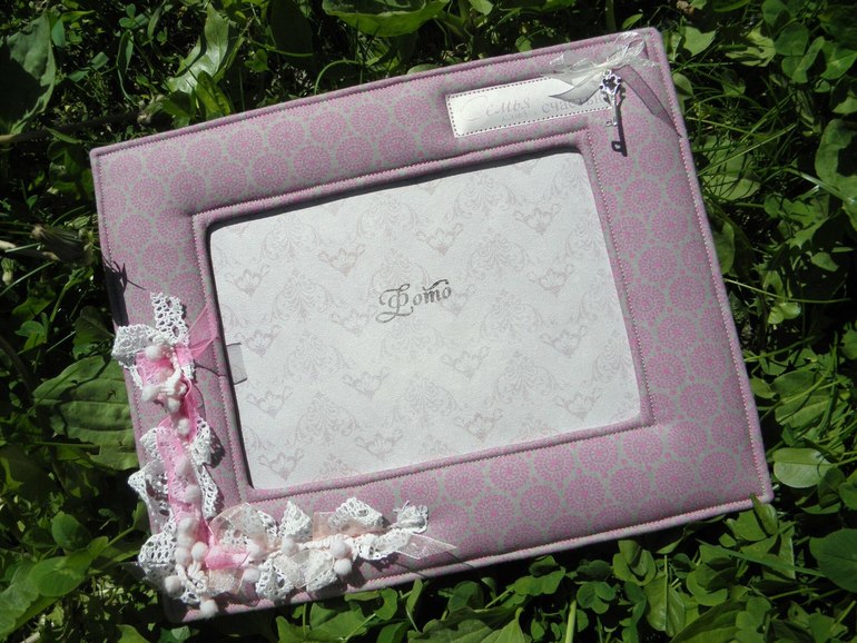 Рамка для фложеото 13Х18см.Проложена синтепоном,обтянута корейским хлопком,украшена хлопковым кружевом,лентой из органзы,репсовой лентой,лентой с помпонами и подвесочкой "ключик".