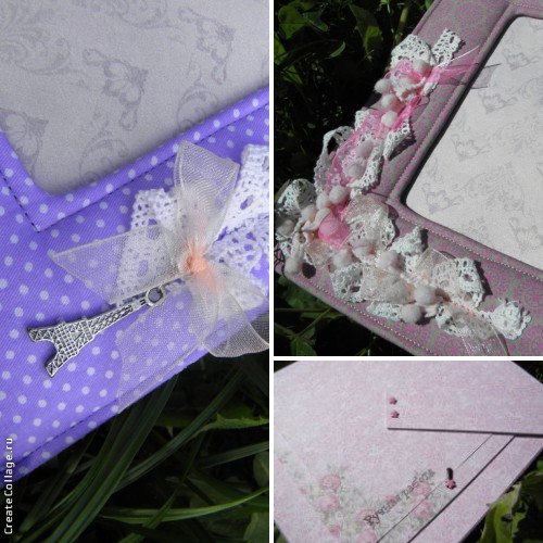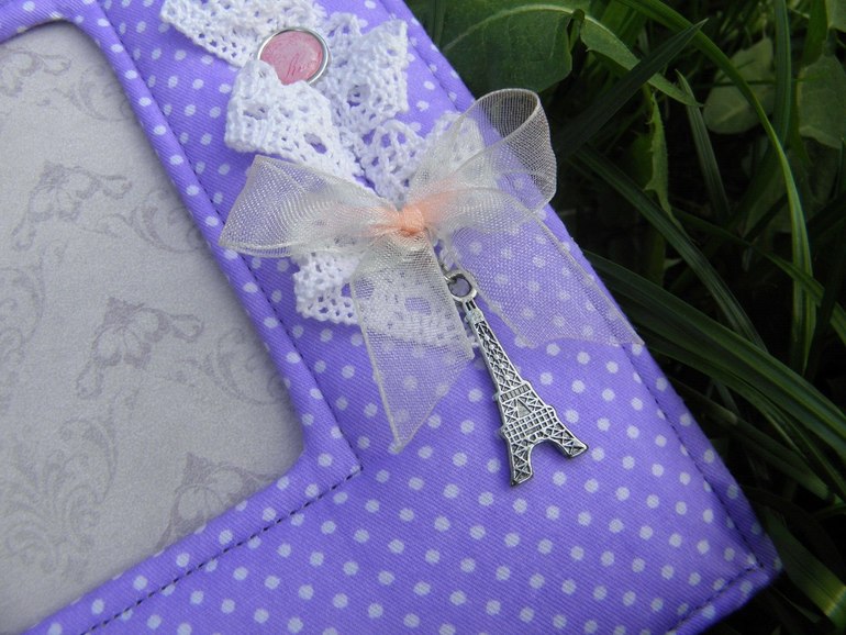Рамка проложена синтепоном,обтянута корейским хлопком,украшена хлопковым кружевом,лентой из органзы,репсовой лентой,лентой с помпонами и подвесочкой "Эйфелева башня".Под фото 10Х15см.