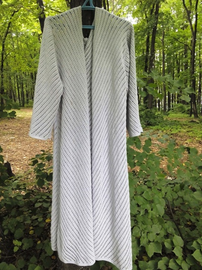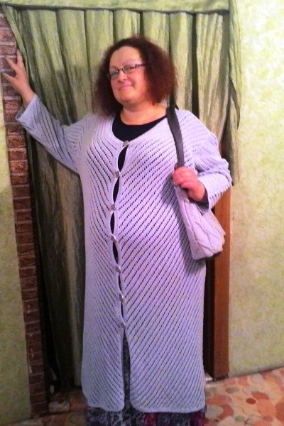 Вязала изначально кардиган на прохладное лето (по моим представлениям), но мама заявила, что будет носить это пальто(!) где-нибудь в сентябре-октябре (а живет мама между прочим в Сибири, не Крайний Север, конечно, но все же... За годы проживания на другом от мамы конце страны я и забыла, что она у меня такая "жаркая"!!) В-общем, пальто маме очень понравилось, она довольна и оказалось, что она такое давно ищет, но никак не найдет (т.к. шепотом-шепотом размерчик 66-68 сложновато найти), так что теперь и искать ничего не нужно))