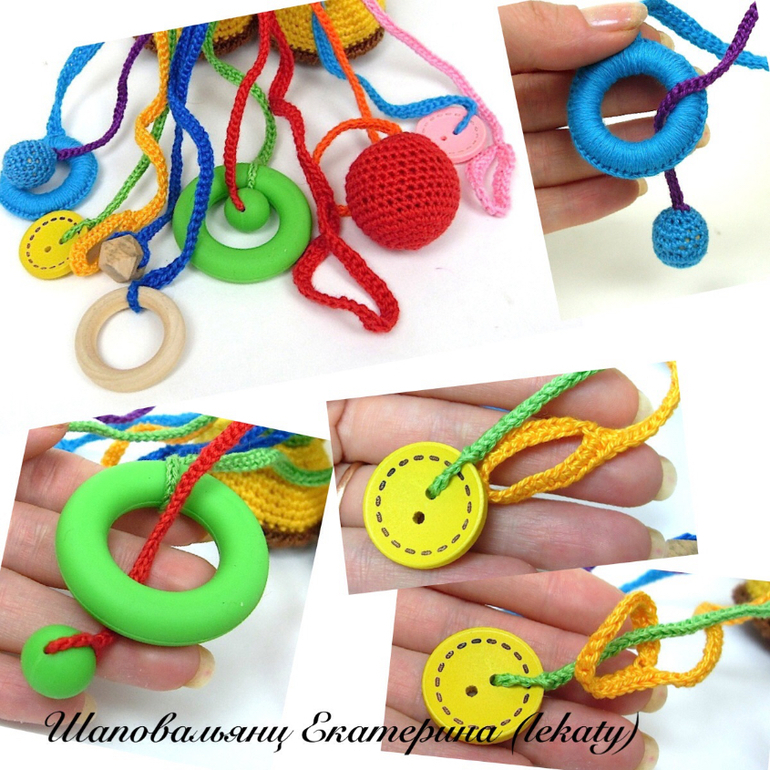 Челочка состоит из различных бусин на ощупь, по материалам и тд. ( деревянные без обвязки, гладкая и многогранная, обвязанная хлопковой пряжей погремушка, акриловая и силиконовая бусинки и обвязанные рельефной вязкой, сеточкой и бугристой, деревянные бусины)