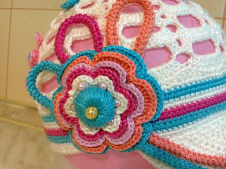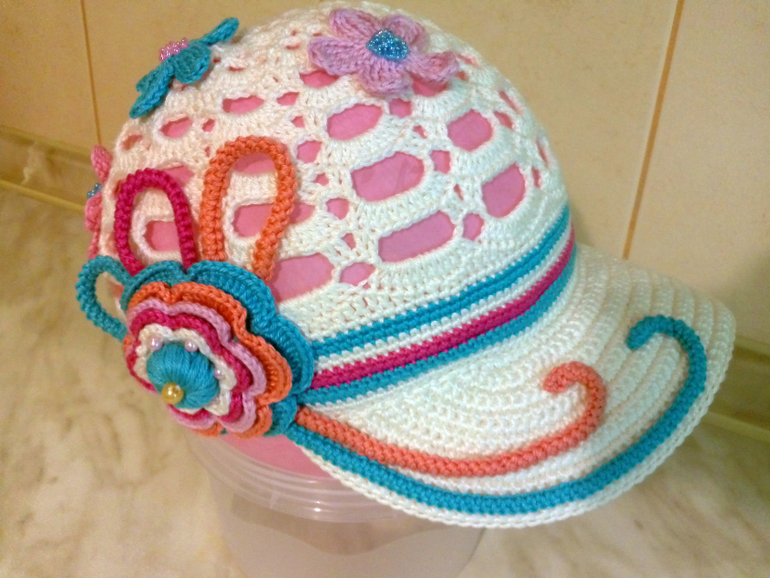 А еще вот такая получилась кепочка, по двум мк из страны мам. Пряжа Бегония, 169 м в 50 г, крючок 2,5 и 2. С козырьком пришлось повозиться. Сначала вязала в одну нить с тонкой леской, и ввязывала в предпоследний ряд леску потолще, потом отпаривала, но он все равно был кривой. Потом распустила, и связала его отдельно в две нити, очень туго, отпарила, пришила мононитью, и тогда стало хорошо. Ушел один моток и чуть-чуть от второго мотка белых ниток, остальных цветов понемногу.