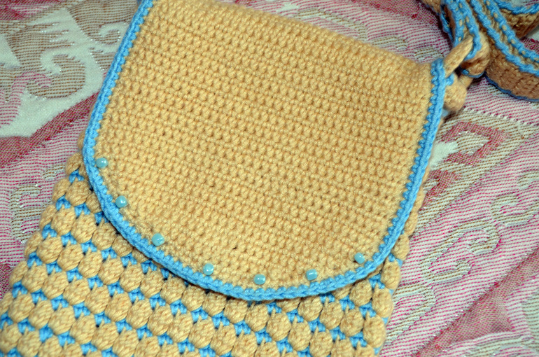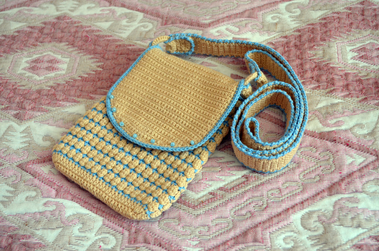 Всем здравствуйте! Связалась у меня такая сумочка. Еще прошлым летом, через год наконец доделала. Связала быстро, с подкладом возилась, особенно с карманом прорезным, в первый раз делала такой. Пряжа Лира от Виты, крючок 3. Ушло где-то 1 моток бежевой и половина мотка голубой, но точно уже не помню.
