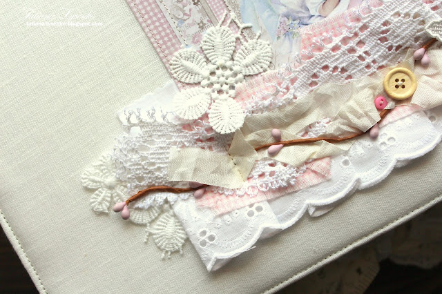 Обложка обтянута льном. Внутри альбом сделан из бумаги MajaDesign коллекции Vintage Baby. 6 разворотов, 12 страниц. В декоре использовано огромное количество хлопкового кружева, шитья, текстиля, шебби лент, чипборда, деревянных украшений и пуговиц, веточек, гипсовых украшений, бисера, вырубки, декоративной машинной строчки, а также тонировки акрилом всех декоративных элементов в альбоме. Альбом вмещает в себя 52 фото формата 10/15 см, а также 9 фото других форматов на обратных сторонках карточек для записей. Есть в альбоме большой конверт, а также карман для ценных мелочей. Завязывается на хлопковую и кружевную ленту. Особенностью этого альбома является то, что он в декоре абсолютно не имеет бумажных цветов, не смотря на то, что нежный и девочковый ;)
