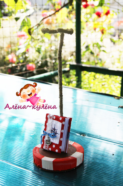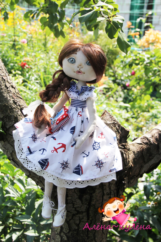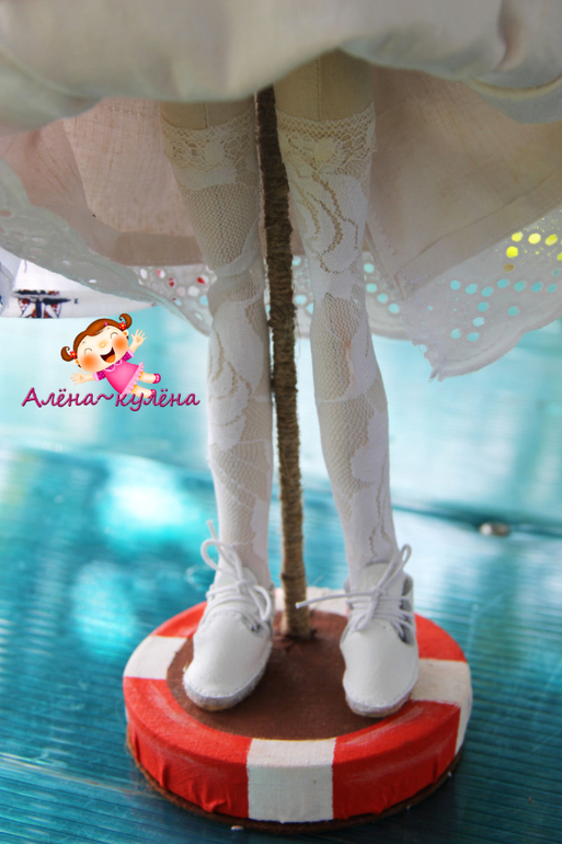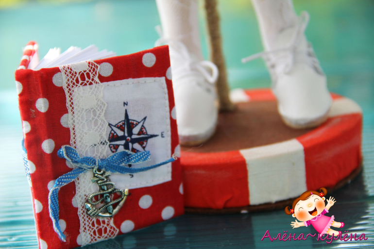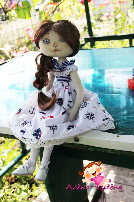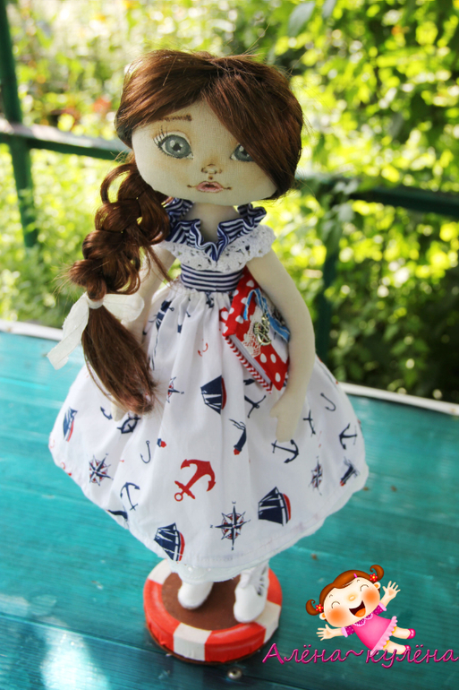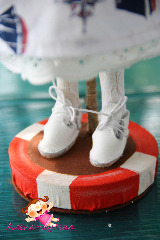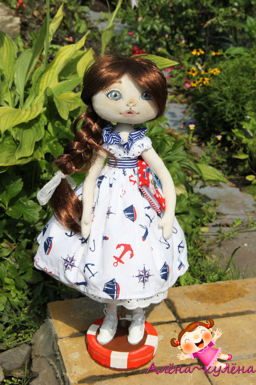 Девочка рослая...41 см, стоит на подставочке (наконец-то у меня дошли руки сделать подставку!!!) в виде спасательного круга..может сидеть самостоятельно, но лучше с опорой..)) ножки и ручки на пуговичном креплении, ножки сгибаются в коленях (шарнир), одежа не снимается, одета в легкое платье в морском стиле, чулки и ботиночки... в руках держит блокнот, в который будет записывать свои заветные мечты о море и путешествиях...