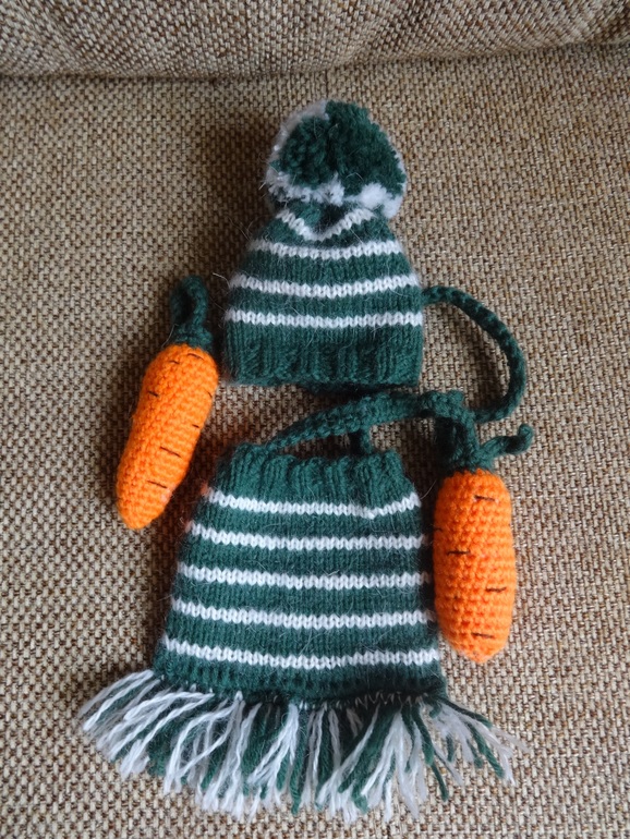 Шапочка, сумочка, а в сумочке вот такие трофеи-морковки.