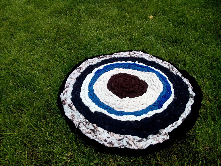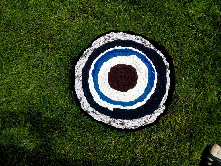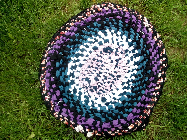 О, это же плетение ковриков. Тоже хочу сплести что-то подобное. Только не знаю, наберу ли трикотажных вещей старых столько, что на коврик хватит. Или проще купить дешевый трикотаж ?