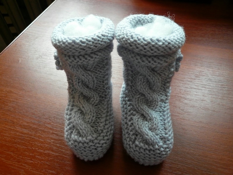 В комплект были связаны несколько пар пинеток. Выношу на ваш суд только одни - спицевые. Сапожки вязались на вырост, носить их будут только сейчас, как раз полное отсутствие лета и погода осенняя.