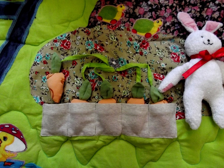 Под деревом живёт Зайка-побегайка. Зайка сшит из носка, чтобы не потерялся зайка и не убежал далеко от своего огорода, пришита липучка на спине. В огороде 5 грядок с морковками, зайки очень любят морковку, да и маленькие детки тоже, мы часто их пробуем на зуб.))))