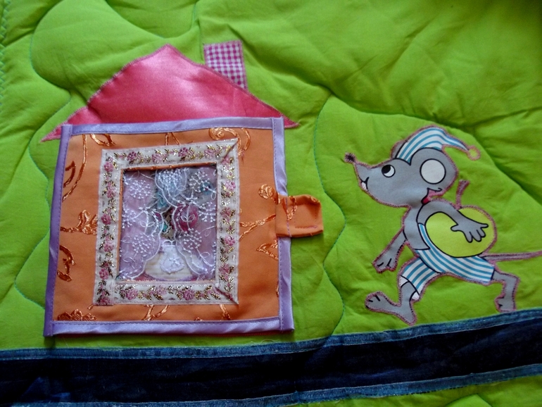 На ковре есть домик, он открывается, застёжка-липучка. Машина сделана в виде кармана, можно посадить зайчика или другую зверушку. Дерево сделано как тетрадь, можно перелистывать.