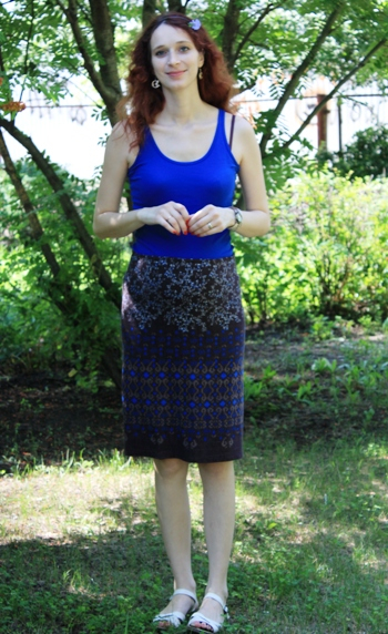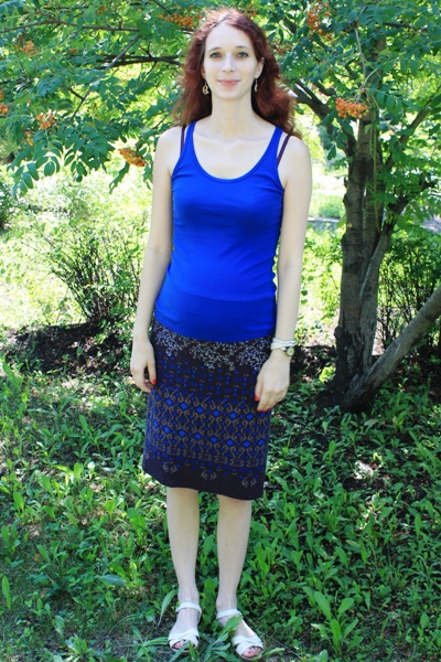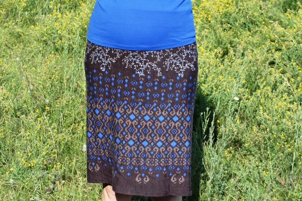 Из тоненького трикотажа. Дался мне этот трикотаж тяжеловато..все куда-то ползет, тянется...ужас! Но, на мой взгляд, оно того стоило)). Ткань очень мягкая, будто бархатистая, поэтому носить юбку из нее сплошное удовольствие, ну и растягивается вместе с ростом живота, так что никуда ничего не давит и движений совершенно не стесняет, но сидит при этом хорошо) В-общем, я довольна))