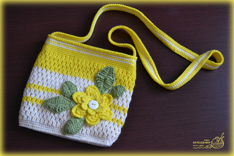 Вот такая солнечная сумочка связалась для маленькой модницы, которой в этом году исполнится 6 лет и она очень хочет быть похожей на маму, чтобы у неё тоже была модная сумочка и можно было носить в ней свои разные нужности.