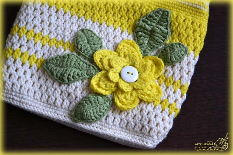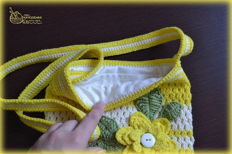 Связана сумочка из пряжи Котон голд молочного и желтенького цветов, украшена цветочком и листиками из Джинса и деревянной пуговкой.