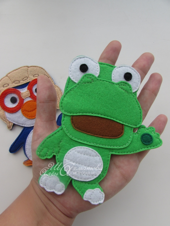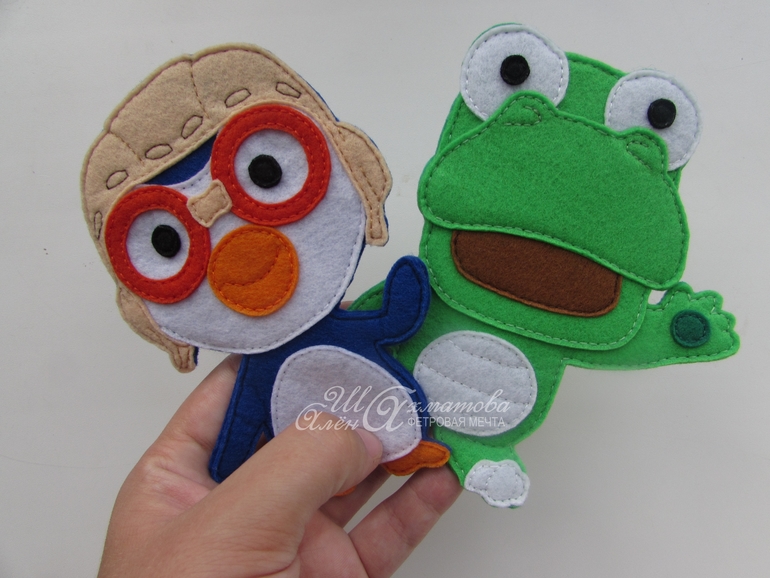 ФетрРешила порадовать дочь, сшить ее любимых героев из мультфильма "Пингвиненок Пороро". Вот что у меня получилось: пингвиненок Пороро и динозаврик Кронг. Сшито вручную)