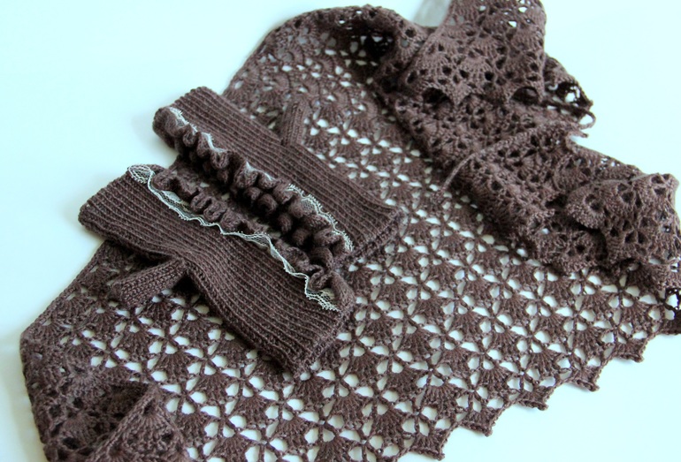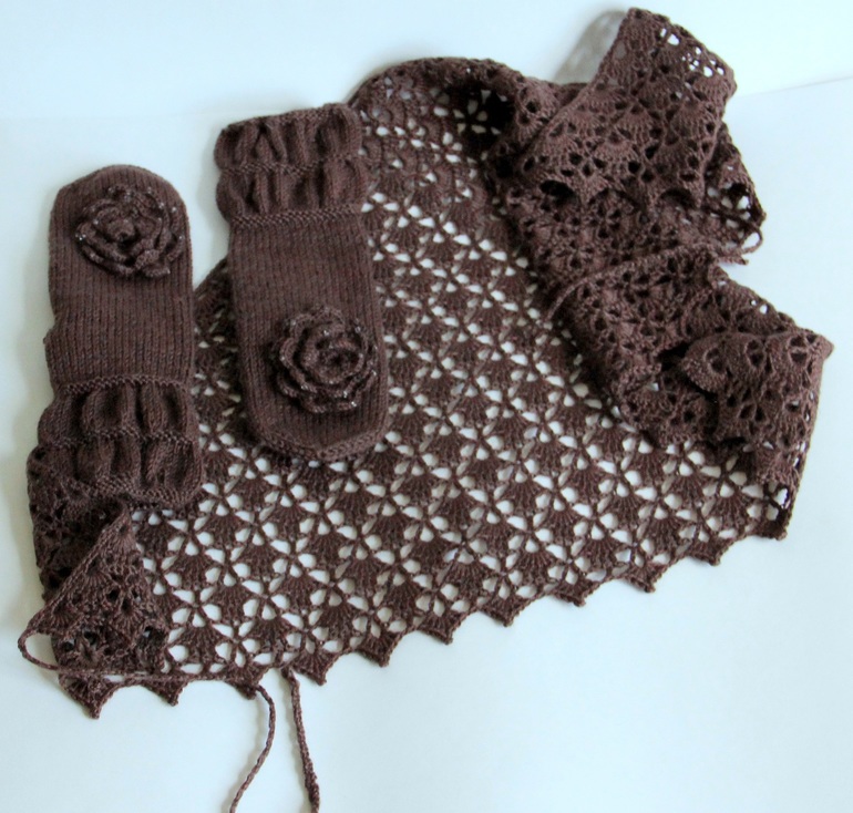 Сначала покажу подарок для меня. Это набор "Шоколад", почти повтор предыдущей Ириной работы, которым я просто бредила, такой красивый (бактус, варежки, митенки).