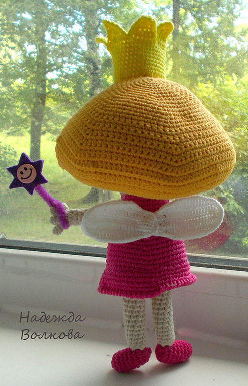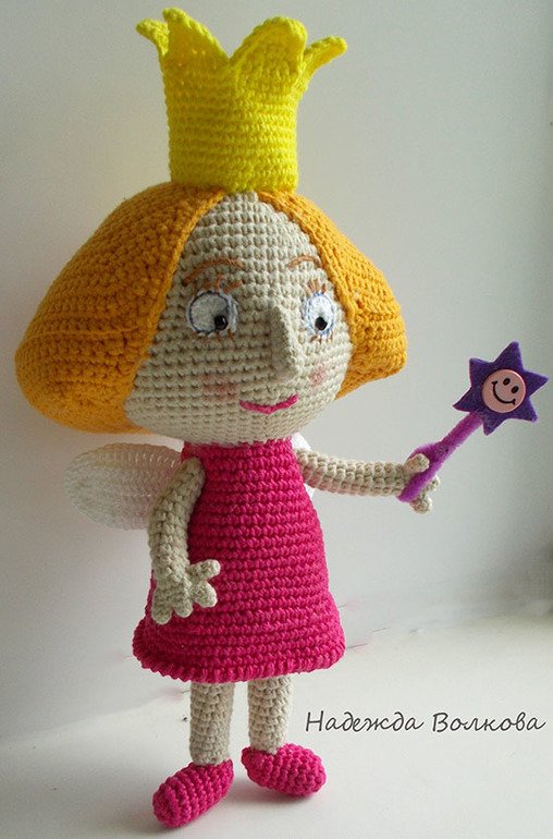 Бена эльфа я вам уже показывала, а теперь готова и Холли. Скоро они отправятся к Лена(декупаж,скрапбукинг,Тильда- на заказ), прихватив с собой еще и Дороти из м\ф "Доктор Плюшева". ее вам тоже уже показывала). Принцесса Холли получилась ростиком 23 см(без короны). Стоит и сидит с опорой, ручки хорошо гнуться, волшебная палочка съемная. Пряжа разная по составу хлопок и хлопок с акрилом, крючок в основном 2.