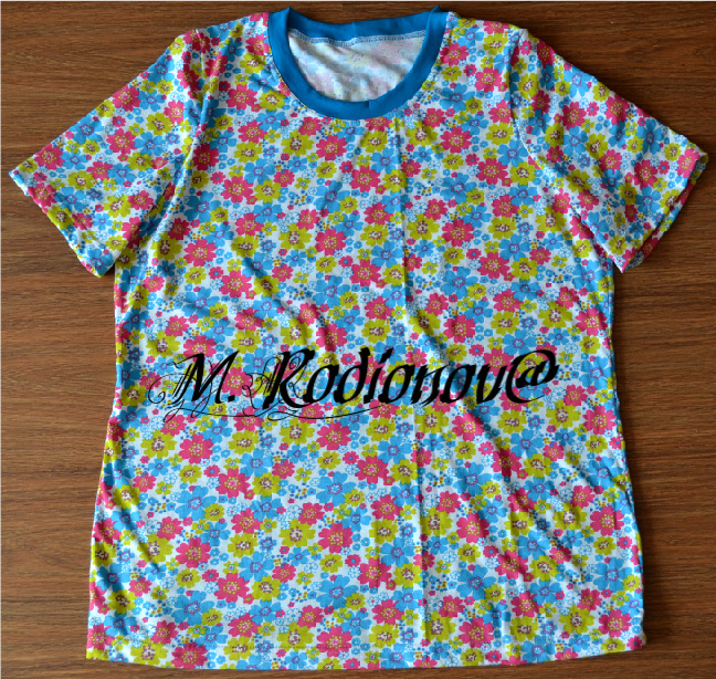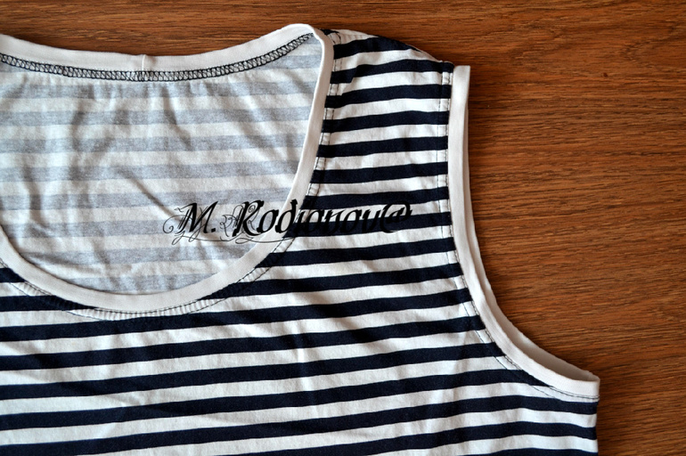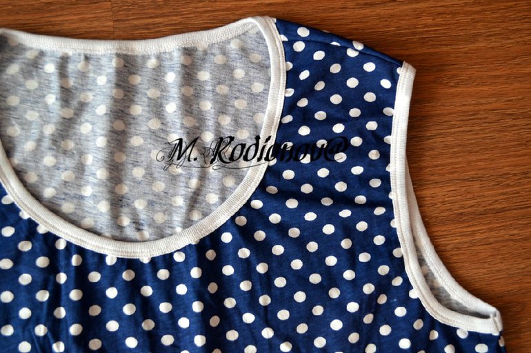 Здесь все вырезы обрабатывала в 2 этапа: сначала на оверлоке пришила бейки из рибаны с лайкрой, а потом уже прошила на распошивалке: