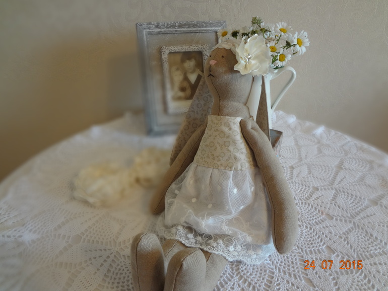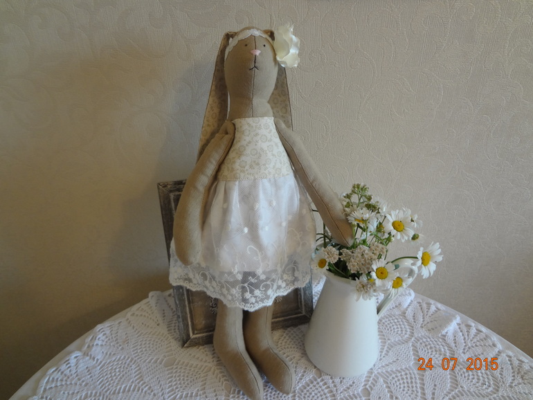 Немного отвлеклась от шитья мишек тедди и сшила зайку в стиле тильда.На мой взгляд она получилась такой милой и нежной и ростик не маленький,целых 40см.Ручки у зайки подвижны,на нитяном креплении. Зайка одета в праздничное платье из хлопка и тонкого кружева,и белые панталончики,а на голове нарядный ободок))).