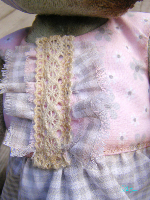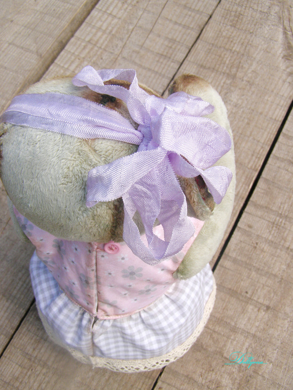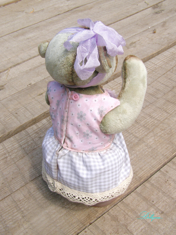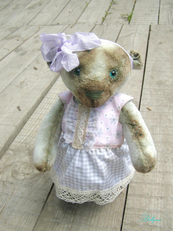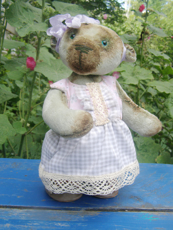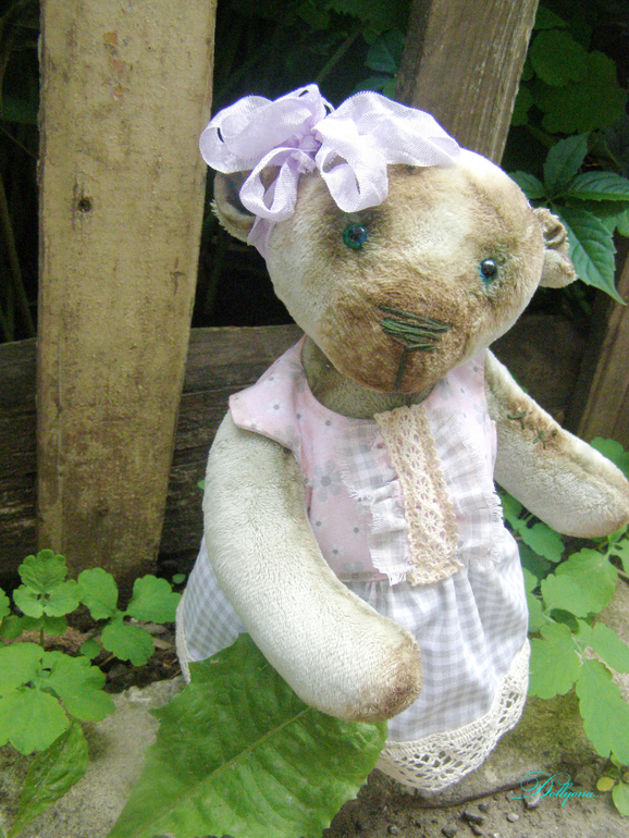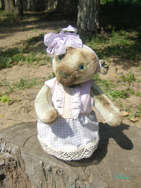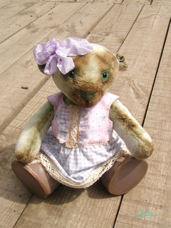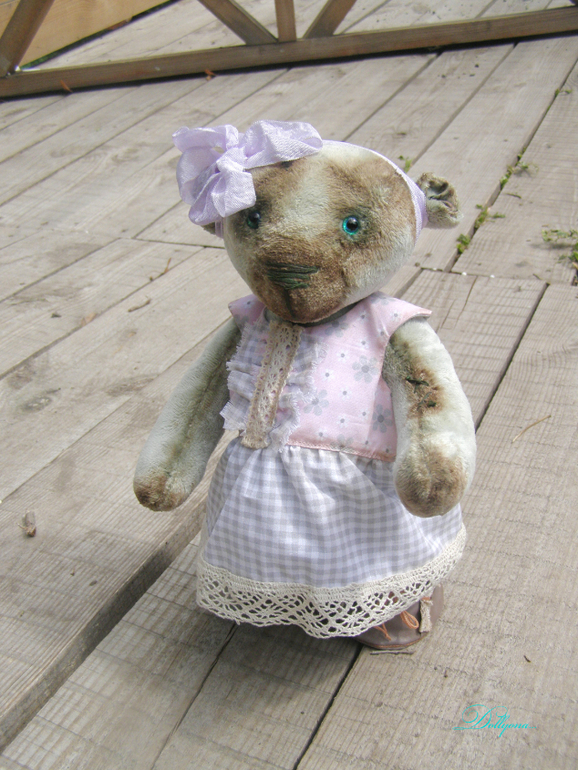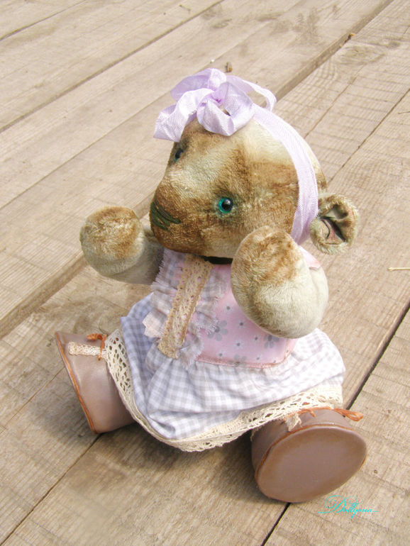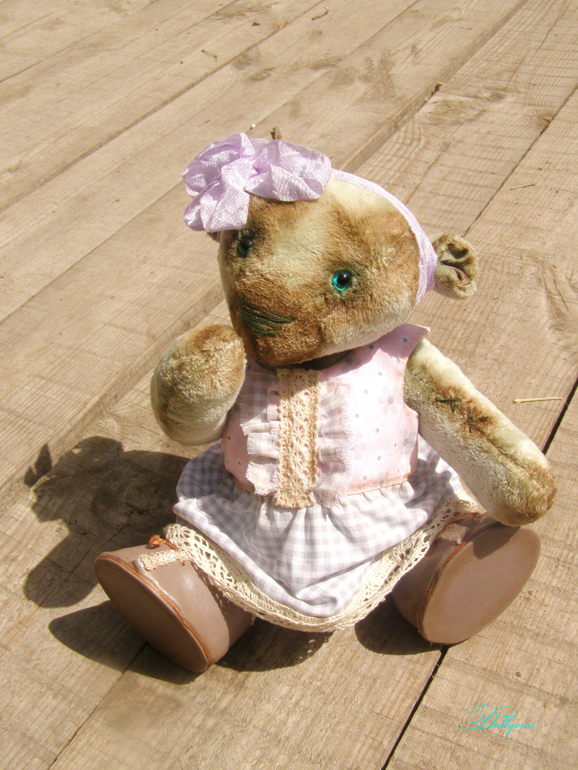 Ахах, первый коммент забавный))) Интересно, что некоторые люди еще не слыхали таких слов, как "винтаж", "тортюр", и, кажется, гордятся этим))) Хехе. И еще как у них язык поворачивается так обижать чужую работу... (Одно дело, что ты реагируешь нормально, а другое — что она себе позволяет написать...)Мишка очень трогательная, нежная, мордочка очень нравится — тонировка, и платьице. А уж обувь... чудо!!