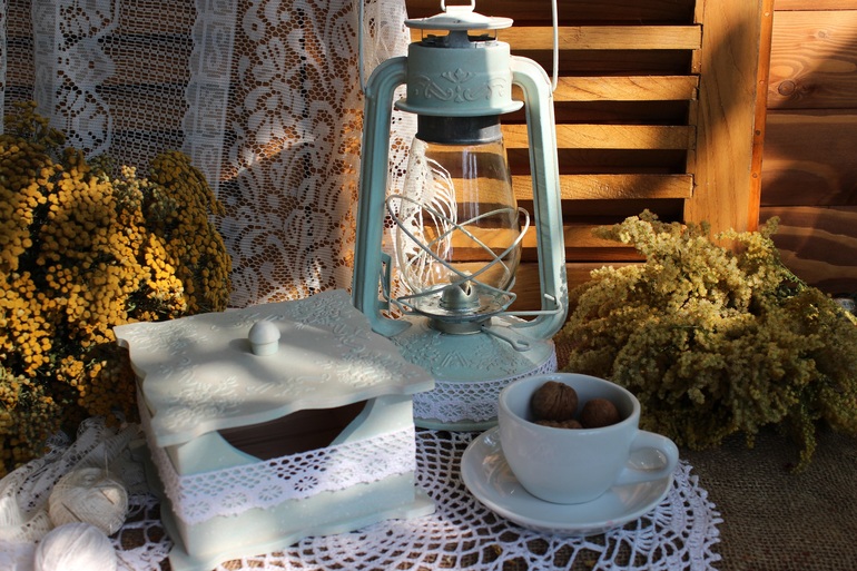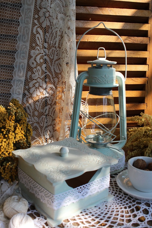 ДекупажТеплейший уютнейший набор-комплект из большой советской керосиновой лампы и салфетницы.К сожалению солнце не дало возможности передать необыкновенный цвет(бирюзово-карамельно-припыленный)этого комплекта.Салфетница чуть светлее по тональности ,чем лампа,но в целом получилось то,что хотелось.
