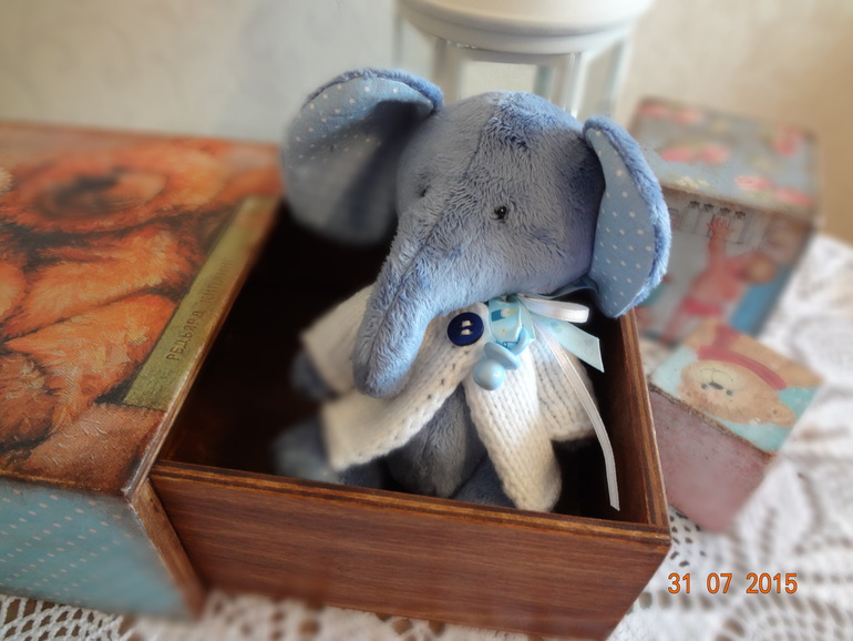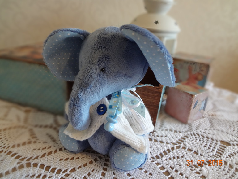 Игрушечный мир - животныеСегодня появился такой вот милый малыш. Слоненок сшит из мягкого плюша,набит плотненько синтепухом,утяжелен,сидит уверенно,стоит с поддержкой. Голова на шплинтовом креплении,ручки и ножки на пуговичном,подвижны. Одет слоненок в белую мягкую кофточку,еще у слоненка есть пустышечка))
