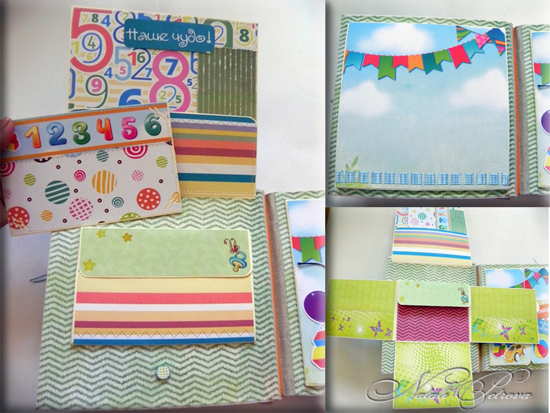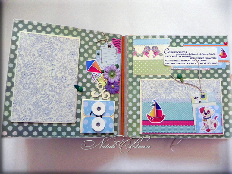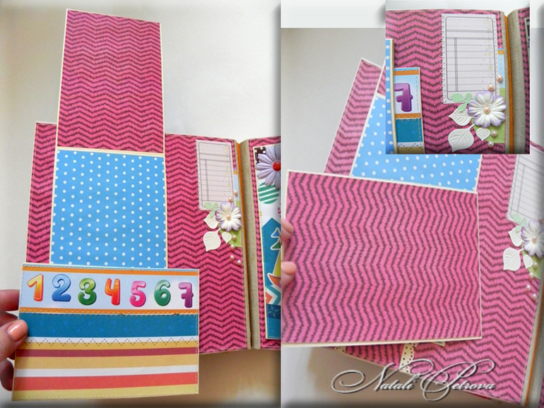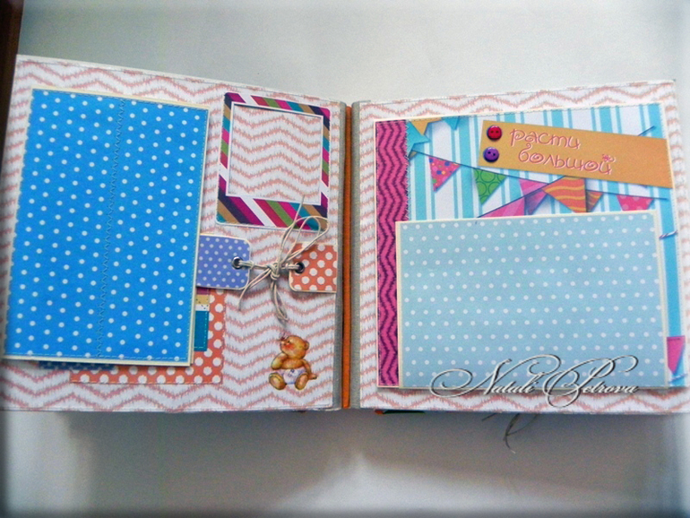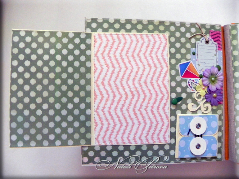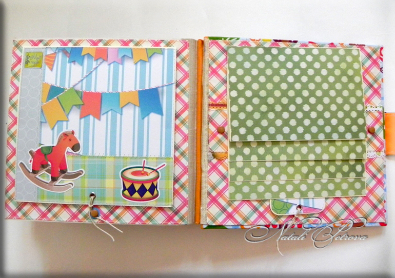 В альбоме шесть разворотов, куча секретиков и много мест для фотографий (количество не считала)