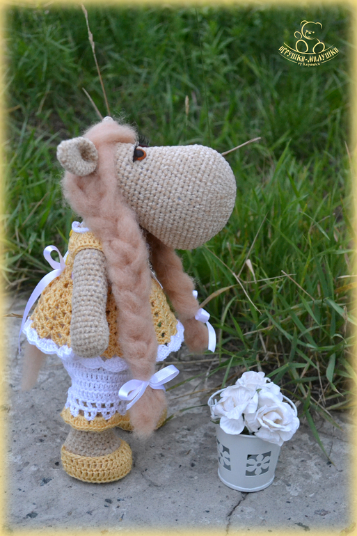 Зорянушка связана крючком из велюровой пряжи, ножки-ручки на нитяном креплении - подвижны, глазки пластиковые, реснички, грива - новозеланская шерсть, слегка привалена сзади по пробору. На головке веночек из искусственных бутончиков.