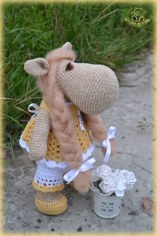 Одета лошадушка в костюмчик, связанный из хлопковой ниточки, который состоит из тапочек, понтолончиков и кофточки, которая застёгивается сзади на 2 пуговки, украшена подвесочкой в виде вишенок. Одежда вся снимается.