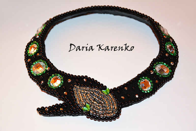 Всем привет! Хочу рассказать вам как сделать очень интересное колье своими руками в виде змейки из бусин, бисера и страз. Украшение смотрится оригинально, держится на застёжке. Для работы я использовала бусины диаметром 4 мм, крупный бисер и стразы. Подробнее, смотрите видео, благодарю за интерес! :)
