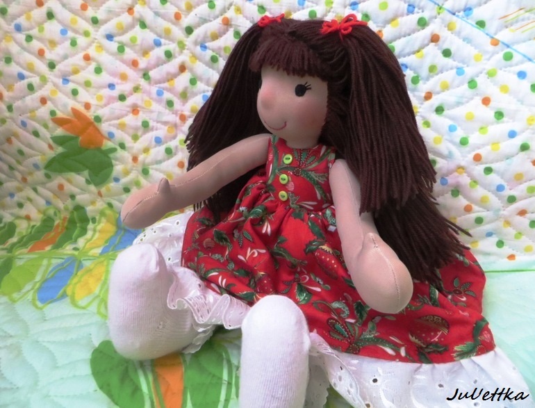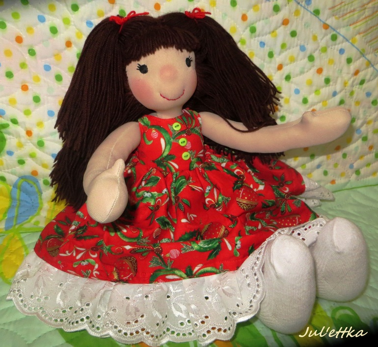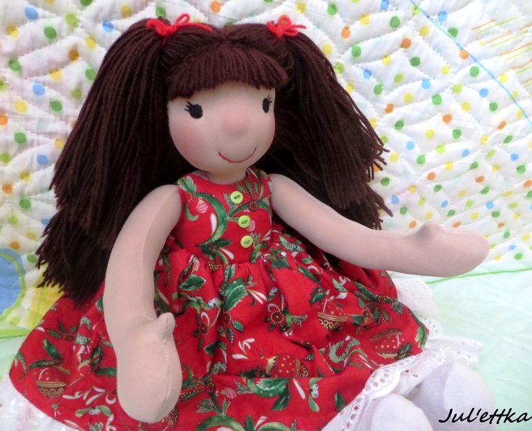 Кукольный мир - человекоподобные куклыУ меня родилась кукла София (имя дала старшая дочь), рост 43 см, это моя первая вальдорфская кукла. Шилась куколка в совметном пошиве, спасибо Елене за МК и СП!!! Было очень интересно! Куколка родилась очень доброй и веселой, но т.к. это первенец не совсем все вышло...целлюлит не смогла избежать (правда набита синтепоном, а не шерстью, да и трикотаж наверное не совсем такой какой был нужен- шила из того что нашла дома). Платье шила не по выкройке МК. Носочки от младшей дочки :)