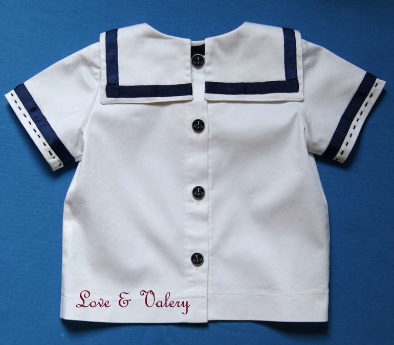 Рубашка и бескозырка выполнены из плотного американского хлопка-стрейтч. Воротник, рукава и ободок шапочки декорированы репсовой лентой. Также рукава и треугольная вставка на воротничке вышиты темно-синей ниткой.