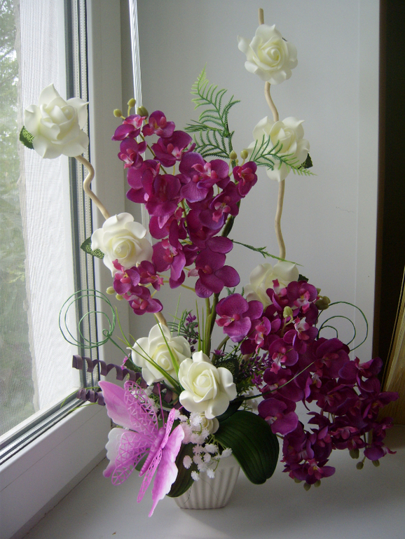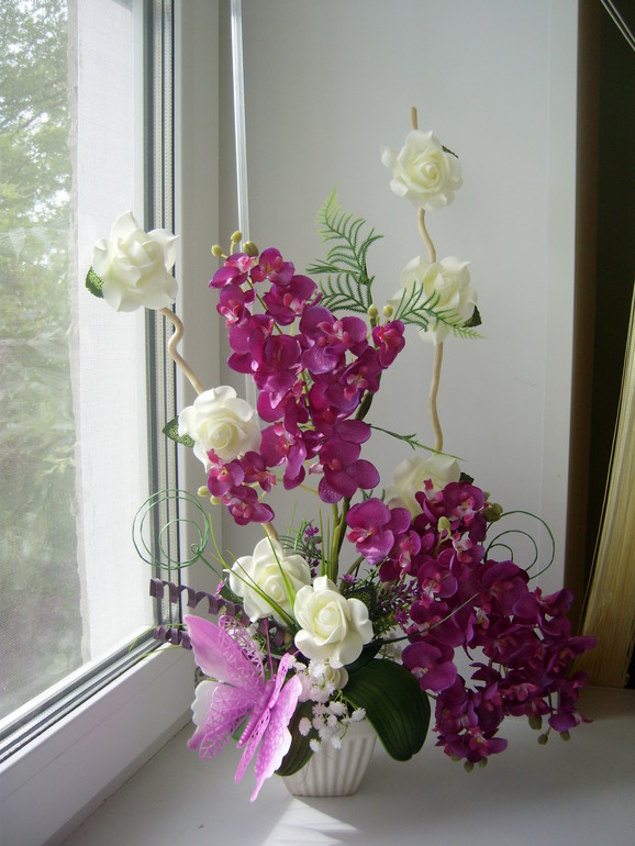 Я когда работала в магазине флористом, то на курсах обязывали соблюдать пропорции, по композиция и топиарит и такие композиции из иск цветов. он не будет отвлекать внимание, а придаст композиции устойчивость. это лично мое мнение по работе вашей.